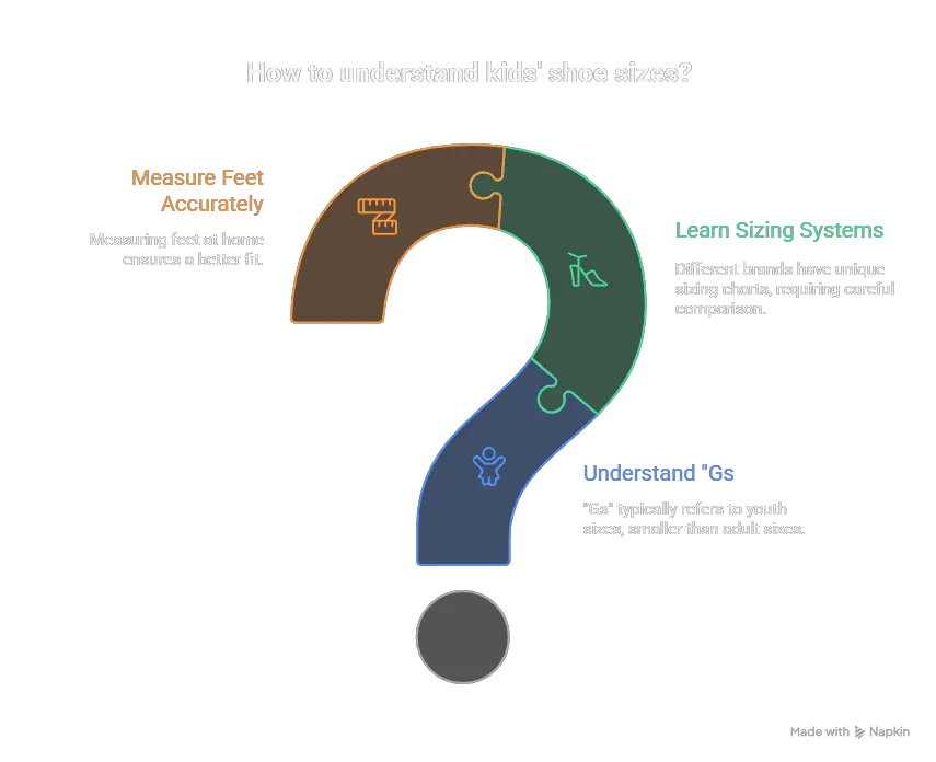 Let’s demystify the world of kids’ shoe sizes, with a focus on what “Gs” signifies. Here’s a step-by-step guide to help you navigate the shoe aisle with confidence.